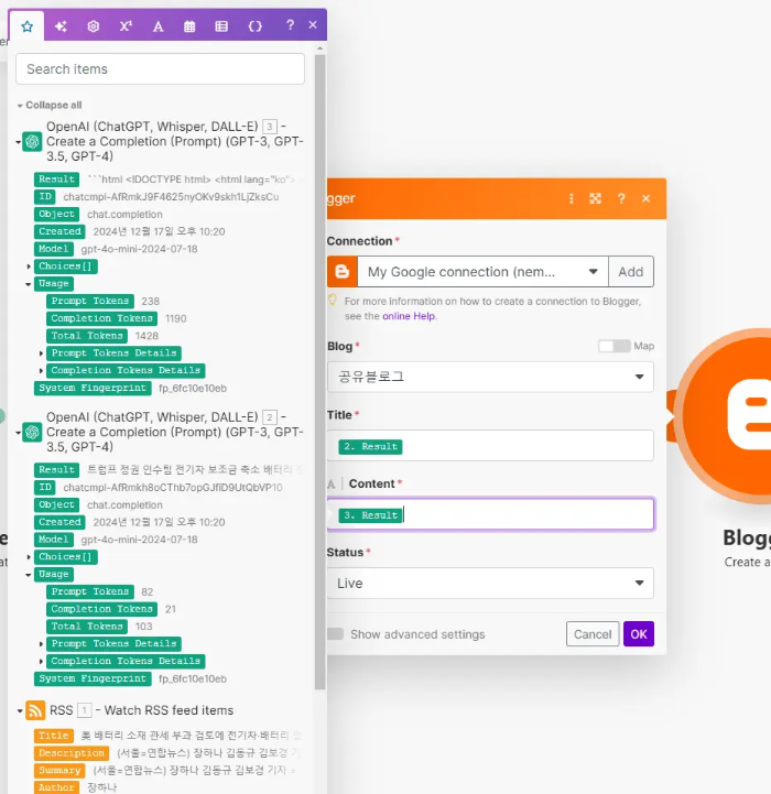 Title은 제목을 생성하는 ChatGPT의 'Result'를 클릭하고, Content는 본문을 생성하는 ChatGPT의 'Result'를 클릭합니다